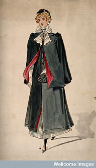 (Near left) Source: A district nurse with her outdoor uniform and bag. Watercolor drawing, Wellcome Library, no. 17436i, http://catalogue.wellcomelibrary.org/record=b1175317. Accessed 6 Oct. 2016.